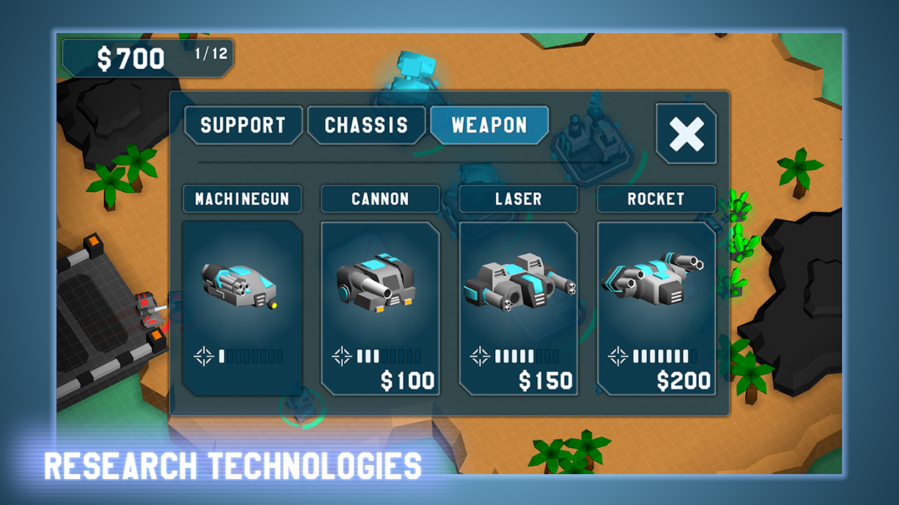 Gameplay primarily consists of building individual units and structures on build pads. You build a refinery to harvest minerals and convert them to money. You then use the money to build a broad assortment of unit components, upgrades and an assortment of structures such as an Armory to unlock multiple component upgrades (also costing money) and a turret for example. Once you create your army, you can converge on the map to take control of Beacons where you can deploy more units. Capturing and keeping Beacons is vital in making your way across the map. Engage and eliminate all opponent units and structures to be declared the victor.